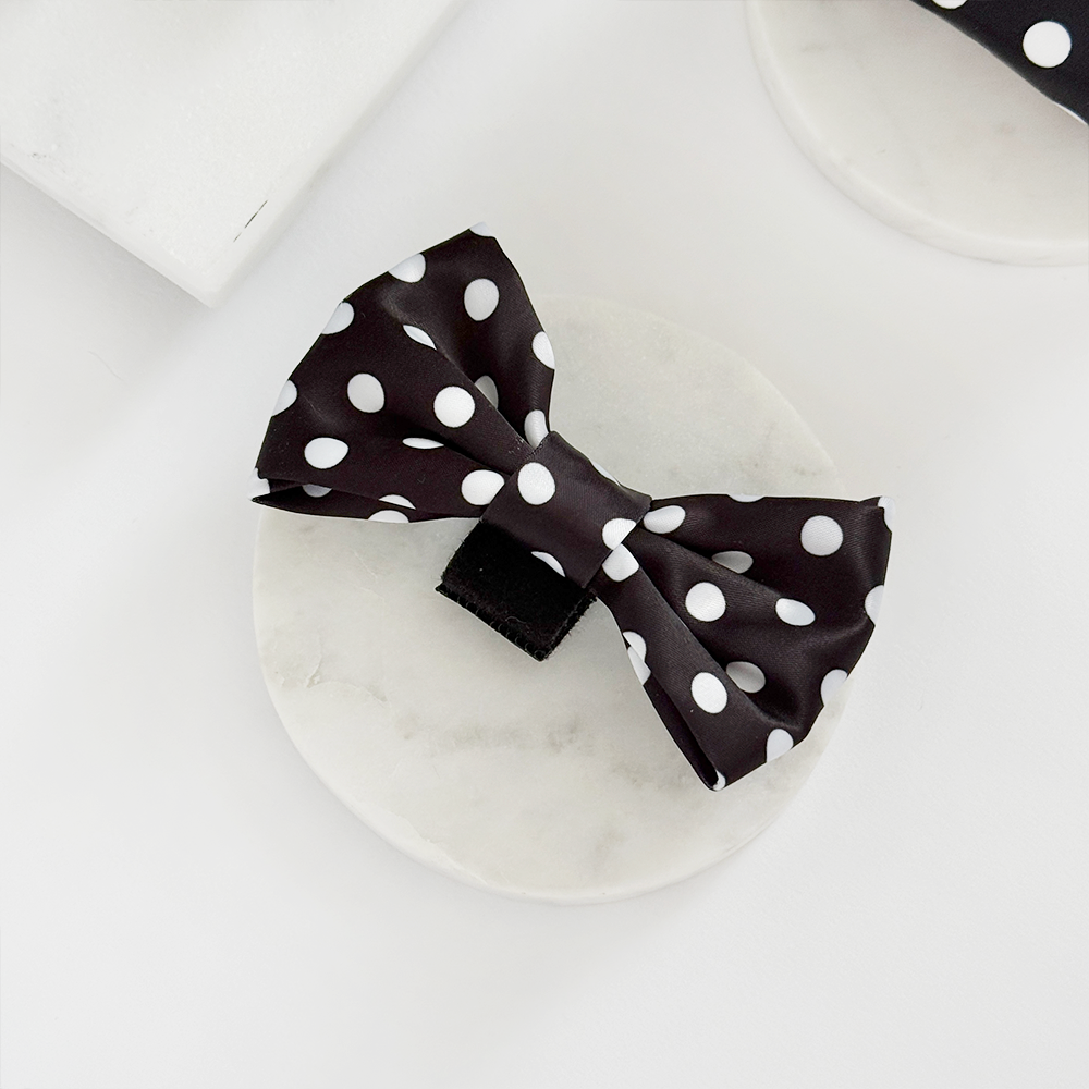 Add a touch of playful charm to your dog walks with this chic Satin Polka Dot Bow Tie. Featuring classic white polka dots on black, it’s the perfect trendy accessory to keep your furry friend looking stylish and fun on every adventure!