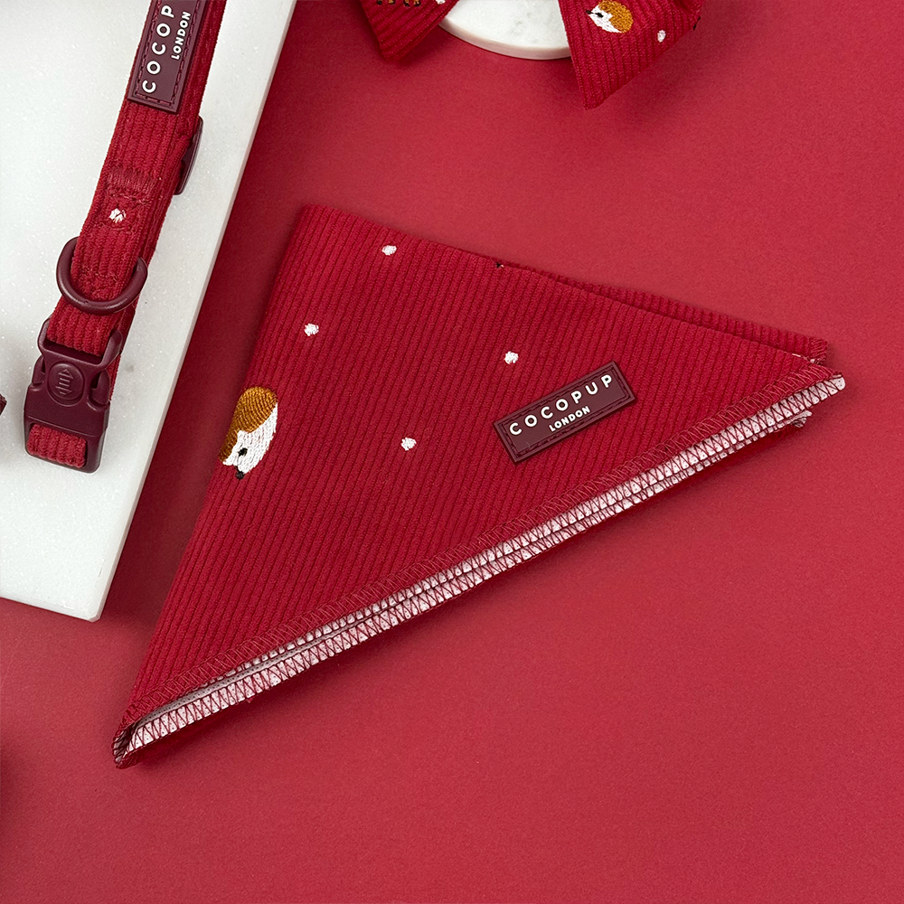 The Holly Jolly Trails Bandana is made from cosy burgundy cord fabric and decorated with delightful embroidered festive friends. Perfect for adding a playful touch to your dog's Christmas walks, this cheerful accessory brings holiday fun to every outdoor adventure.
