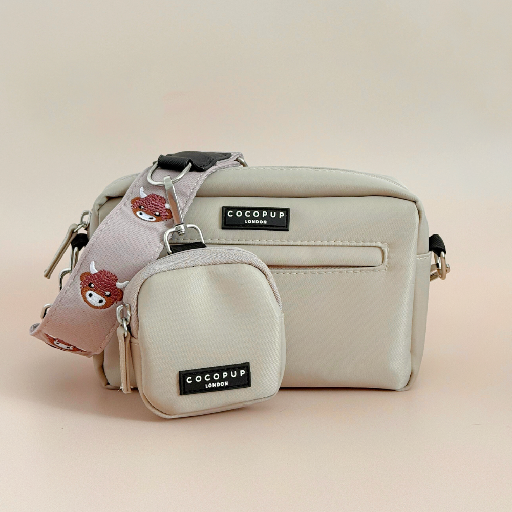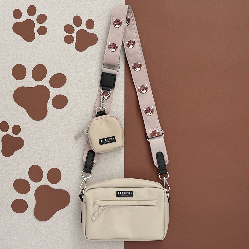 Take your dog for a walk in style with this Bundle featuring the Dog Walking Caramel Latte Bag and Harold the Highland Cow Bag Strap.