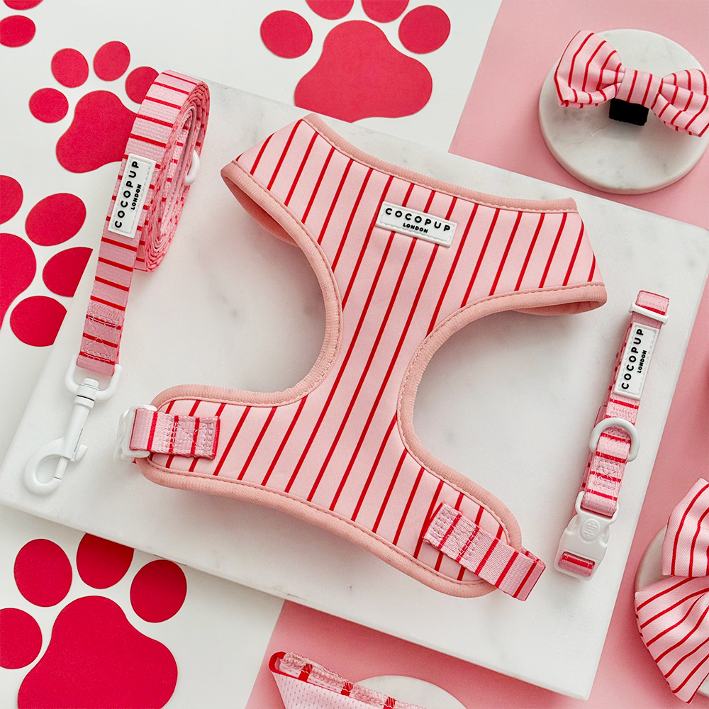 Sprinkle some sweetness into your dog's daily adventures with this vibrant Candy Stripes bundle! Featuring bold pink and red stripes, this set, complete with adjustable harness, matching lead, and collar brings instant charm to park visits and brunch stops. Perfect for Valentine's day or anyone craving a cheerful splash of colour, it's the ultimate way to let your pup's personality shine. Fun, functional, and utterly delightful!