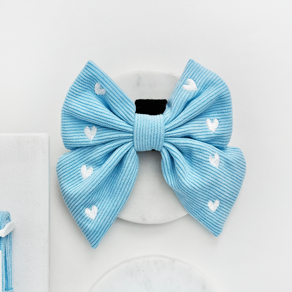 Make your pup the star of every walk with the Blue Heartstrings Cord Sailor Bow Tie. Crafted from baby blue cord material and adorned with sweet white embroidered hearts, this playful accessory will make your pup super cute!