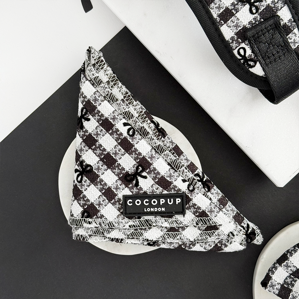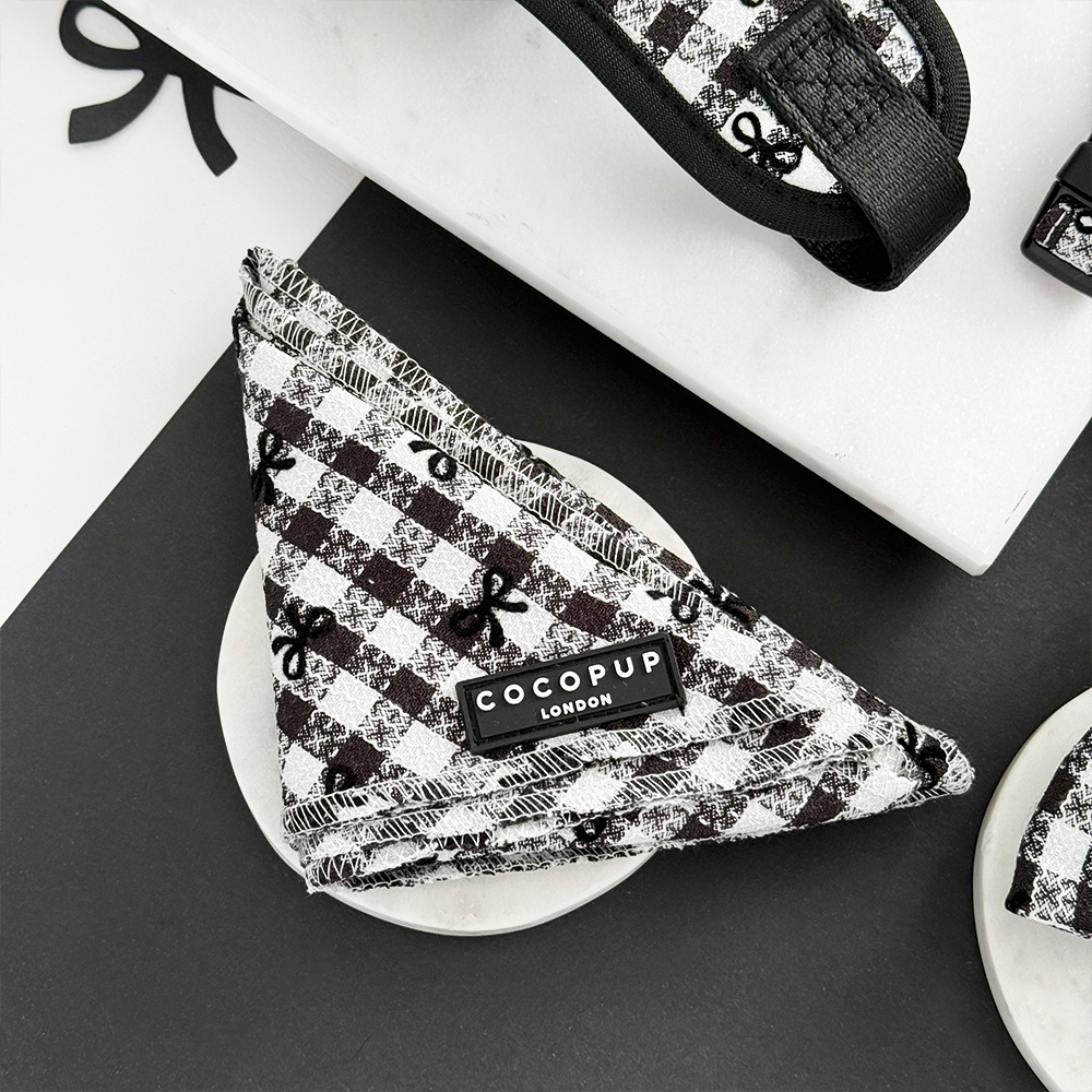 Get ready to unleash some serious style with our Bandana - Pup in Paris. Featuring a chic black and white checked design with adorable embroidered bows, this dog walk accessory will have your pup turning heads on every stroll.